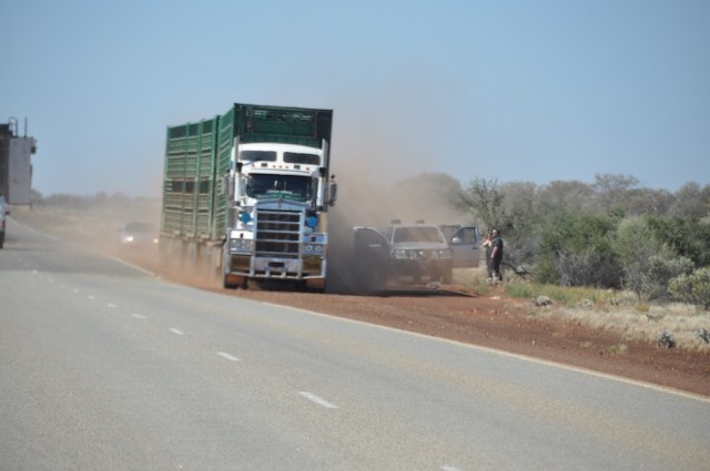Irgendwie schafft es der Roadtrain sich zwischen Schwertransporter und abgestelltem PKW durchzufädeln. Der Staub und der Schreck für die PKW Fahrer muss aber phänomenal gewesen sein, sie haben den von hinten kommenden Roadtrain nicht bemerkt, bis zu dem Moment, wo er haarscharf an ihnen vorbei donnert.
