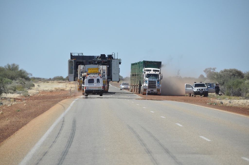 Irgendwie schafft es der Roadtrain sich zwischen Schwertransporter und abgestelltem PKW durchzufädeln. Der Staub und der Schreck für die PKW Fahrer muss aber phänomenal gewesen sein, sie haben den von hinten kommenden Roadtrain nicht bemerkt, bis zu dem Moment, wo er haarscharf an ihnen vorbei donnert.