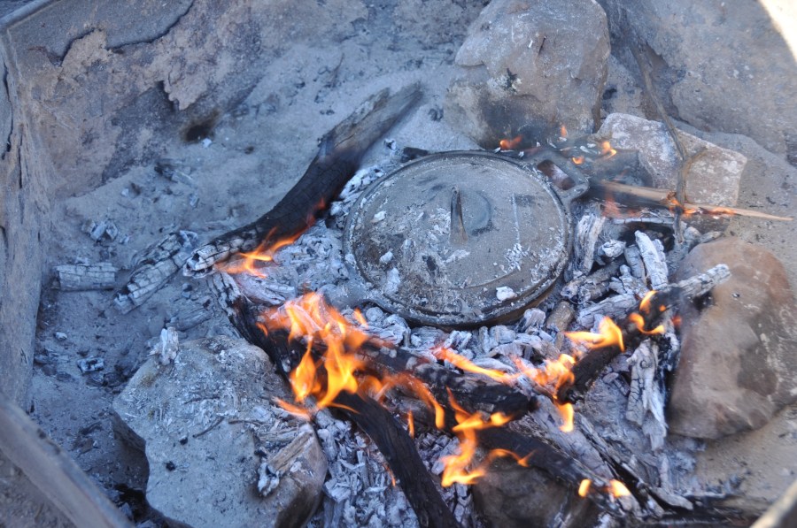 Direkt über dem Feuer wird der Gusseiserne Topf am Abend für Gemüseeintopf mit Fleisch verwendet. Das Rezept von gestern war: 200g Fleisch, 400g Karotten, Süßkartoffeln, Sellerie, Linsen, Feigen, Knoblauch, Zwiebel und Gewürze in den Topf und etwas Wasser dazu geben. Vierzig Minuten am Feuer, bei nicht zu großer Hitze kochen lassen. Das Ergebnis ist fabelhaft – meine liebe Grudrun hat sich damit die vierte Gault Millau Haube erkocht.