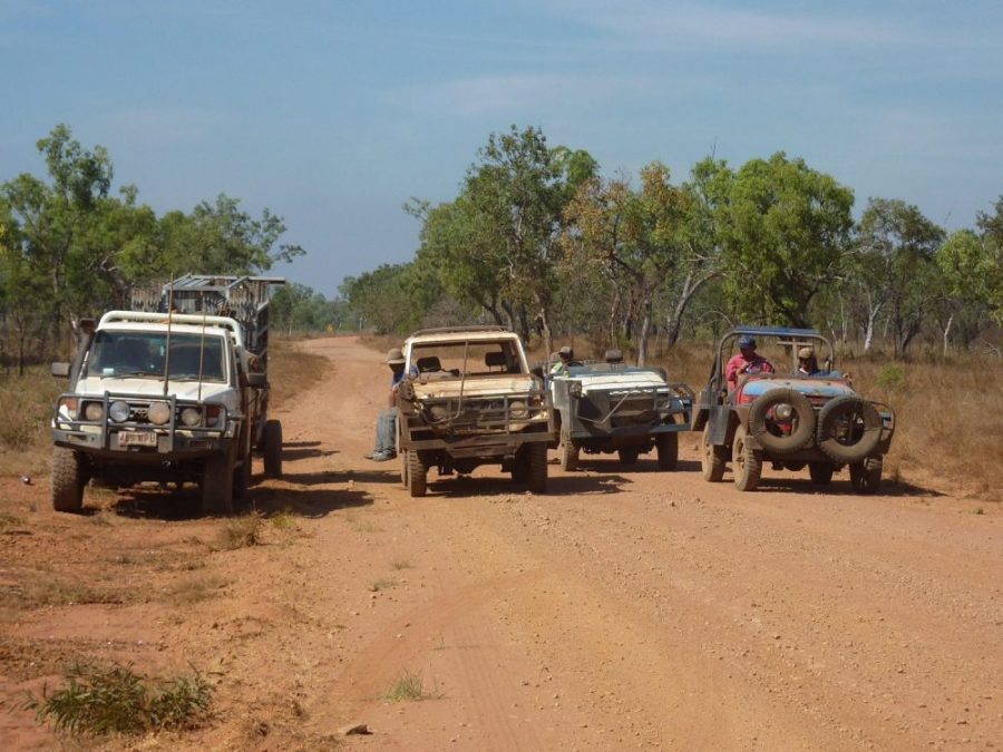 Am Weg nach Lorella Spring haben wir die Gelegenheit, ein Buffalo Catching (Wildkühe einfangen), miterleben zu können. In Nationalparks, wie in unserem Fall im Limmen Nationalpark, soll kein Weidevieh sein. Weil die Zäune bei den riesigen Farmen im Norden von Australien oft über 1000 km lang sind werden Löcher meist erst spät entdeckt und Vieh kann in Richtung Nationalpark ausbüchsen. Wenn mal Zeit ist, macht sich ein Trupp von einer angrenzenden Farm auf den Weg um ihr liebes Vieh zu suchen. Rund um die Wasserlöcher ist in der Trockenzeit dann ein guter Tipp genauer zu schauen. Das Suchen und Zusammentreiben geschieht mit einem Hubschrauber, Landunterstützung erhält der Pilot durch die Kavallerie in Autos Marke Mad Max.