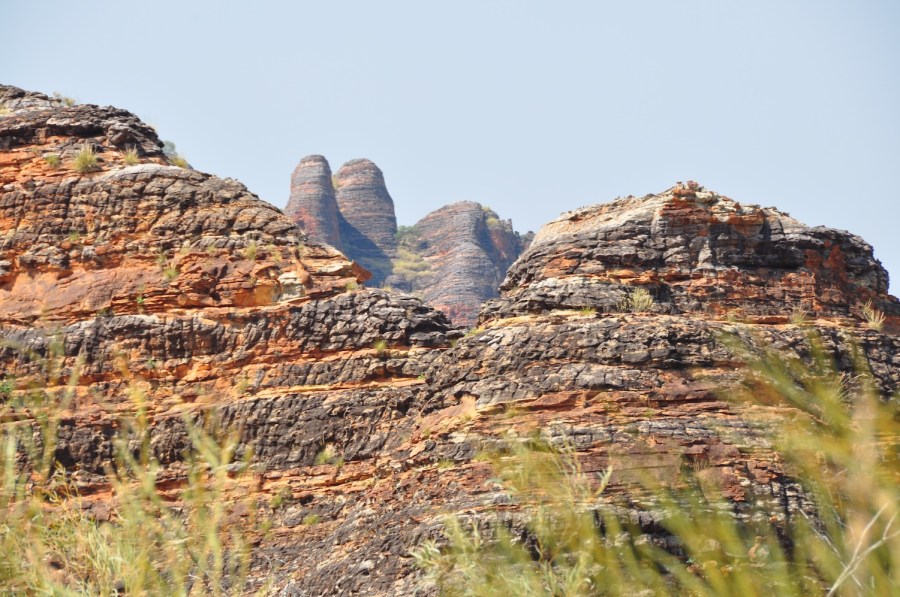 Purnululu Nationalpark: Purnululu bedeutet Sandstein. Die Formationen, die wir hier sehen, sind vor etwa 20 Mio. Jahren entstanden. Der südöstliche Teil des Parks ist geprägt von den sogenannten „Bienenkörben“, auffällig ist dabei die horizontale Schichtung von eisenhaltigem Sandstein, Konglomeraten und Cyanobakterienkrusten. Wird eine Schicht von aussen beschädigt, löst sich der Kegel kurzfristig auf und zerfällt. Die bis zu 200-300 m hohen Bienenkörbe sind komplett vegetationslos, da während der Regenzeit die Erde völlig weggespült wird. Witzig ist, dass diese Bienenkörbe zufällig erst 1983 vom Flugzeug aus entdeckt wurden, vier Jahre später als schützenswert eingestuft und 2003 schließlich zum Worldheritage – Naturerbe erklärt wurden.